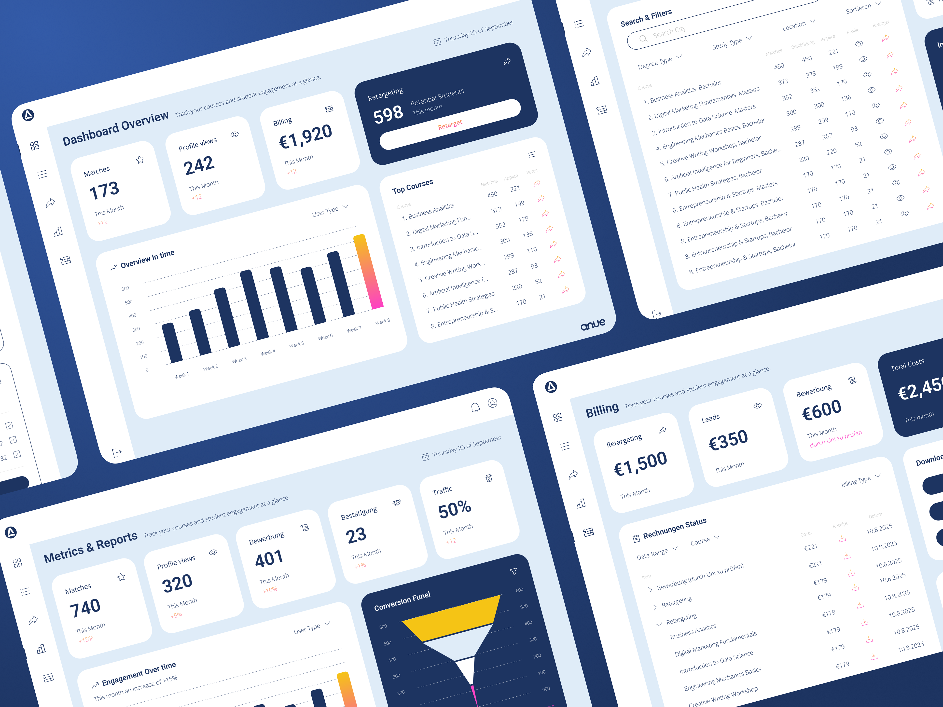 This project focused on designing a B2B dashboard for universities using Anue’s premium subscription. The dashboard provides institutions with access to user-generated data from the platform, enabling them to analyze course demand, identify students interested in specific programs, and retarget potential applicants through direct communication. The goal was to transform platform insights into clear, actionable information that supports universities in their recruitment strategies.
